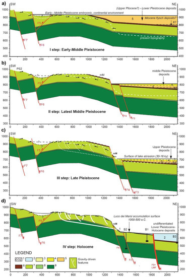 A multiple-step model of the slope’s morphotectonic evolution was drawn in Di Luzio et al. [39], which included the main erosive, depositional, and tectonic events since the Early Pleistocene to the historical times (Figure 4). According to the model, apex of normal faulting, linked to the opening of the Fucino Basin, occurred in the Late Pleistocene. Such a tectonic process determined the slope lateral unconfinement necessary to trigger the DSGSD. Nowadays, the fault activity is shifted basin-ward along the Luco dei Marsi structural line (LMF, F0 in Figure 2).