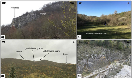 Morphological features of the Luco dei Marsi DSGSD: (a) trench; (b) gravitational graben with flat-bottom depression; (c) system of trench, gravitational graben, and uphill-facing scarp; (d) outcrop of the BSZ.