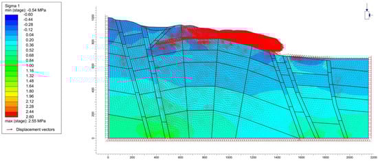The numerical modeling demonstrated that both the BSZ and the shallow features were formed progressively over time because of an ongoing damaging process. Their development was controlled both by the slope debuttressing phases due to normal faulting and by the progress of the viscosity-driven process. The latter, even if it has not produced significant displacements, has favored the variation of the stress-strain state of the rock mass and the progressive plasticization of some sectors for the achievement of tertiary creep. The displacements computed in the calculation stages resulted in the order of a few millimeters or, at most, a few centimeters. The differences with respect to the strains recorded through interferometric analyzes of geomorphological studies—of the order of a few mm/yr [39]—can be related to plastic strains (mainly occurring along the joints), for which displacement cannot be analyzed using the here performed simulation approach.
