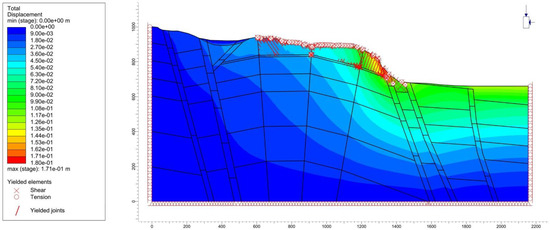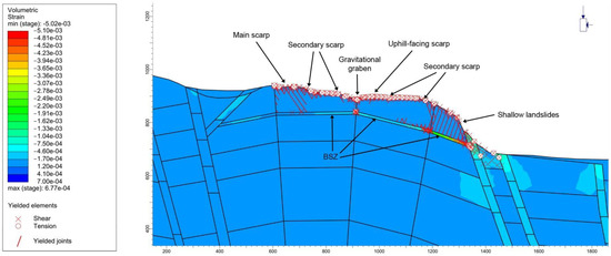Regarding the joint sets (Figure 11), the model shows an arrangement that reflects the main characteristics of the deformational process detected through field surveys. Many ruptures are located at the surface and in the lower part of the slope, where the morphology of the ridge favors the development of several secondary and shallow landslides. Significant yielded joints are present in the upper portion of the slope, where they constitute the main shear zone of the deformational process. The most important failures are present at the base of the DSGSD, in correspondence with the HJL, which in the model includes the BSZ. In this case, the failures occur along the bedding planes in the anticline forelimb, which therefore control the evolution of the deformational process, especially in the outermost portion of the slope.