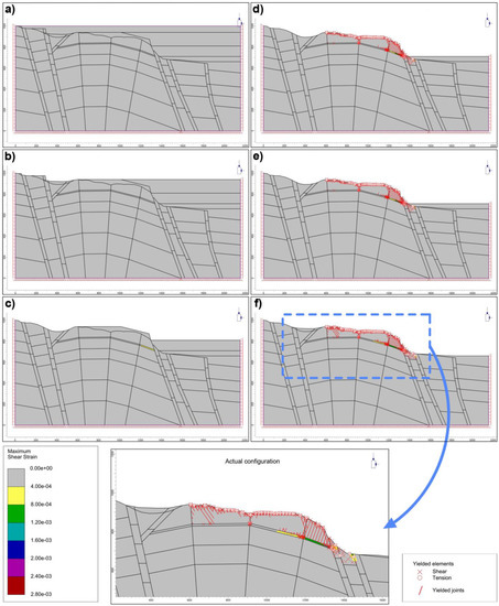 Evolutionary model, maximum shear strain, and yielded nodes/joints along the modeled section: (a) Initial condition; (b) Early-Middle Pleistocene; (c) Latest Middle Pleistocene; (d) Latest Pleistocene; (e) Latest Pleistocene after partial slope unloading; (f) Holocene. Visco-plastic deformations were applied to stage (e) (90,000 years) and (f) (30,000 years). x-axis is in meters, while y-axis is in meters a.s.l.