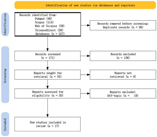A total of 227 publications were identified from the following databases: PubMed (48), Scopus (114), Web of Science (39) and ScienceDirect (26), which led to 171 articles after removing duplicates (56). Analysis of the title and abstract resulted in the exclusion of 136 articles. The writers successfully sought the remaining 35 papers for retrieval and evaluated their eligibility. The approach resulted in the exclusion of 18 articles for being off-topic. The evaluation includes the final 17 papers for qualitative analysis (Figure 1).