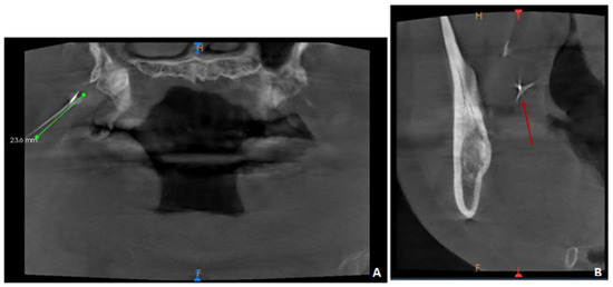 (A) CBCT views with the fragment measure (23.6 mm); (B) CBCT views with part of a needle visualized in the right pterygomandibular space (red arrow). Scattering effect due to the presence of metal.
