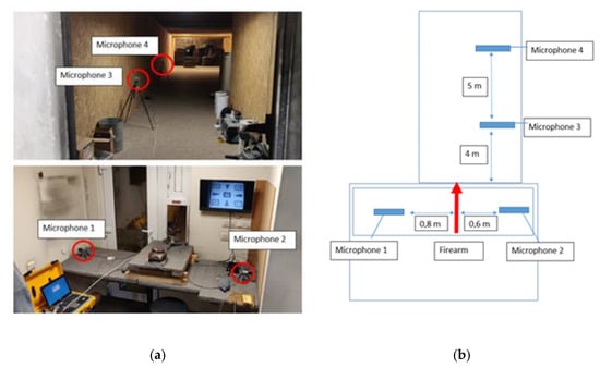 In this study, short and high-frequency acoustic pulses of more than 140 dB prevail during the shot, so high-quality vibration measuring instruments from the Danish company Brüel & Kjær are used. Vibration and other dynamic measurement and analysis equipment is used to test the acoustic characteristics, including Brüel & Kjær Mobile Diagnostics Toolbox Type 7927, with a Dell Computer and Grass 46DP Microphones. Measuring points 1 and 2 (microphones 1 and 2 in Figure 2a) are located at a distance of 0.8 and 0.6 m from the shooter on the left and right sides, respectively. The position of measuring points 3 and 4 (microphones 3 and 4 in Figure 2a) are at a distance of 4 and 9 m from the source of the shot.