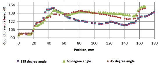 After the simulation and systematization of the results, the changes made by the structural elements between the sound pressure values of the different configurations are observed. Examining the position dependence, the 25 mm spacing shows the exit of the silencer mouth. Further values indicate the path to the barrel mouth where the attachment area to the weapon is located, and the firing element passes into the environment of the other device (Figure 6). Comparing the variations in the 45° model, the pressure level varies in the range of 147.2–119.6 dB, while in the 60° version 151.5–120.6 dB values are recorded, and in the 135° configuration, 139.7–117.8 dB results are obtained in the direction of exposure to atmospheric conditions. A comparison of the sound pressure level in the open cavity models (without being shortened by three partitions) is given in Figure 7. The typical variants are presented as when the angle of inclination of the partitions is 45° and the comparison is when the angle of inclination of the partitions was changed in 60° and 135°.