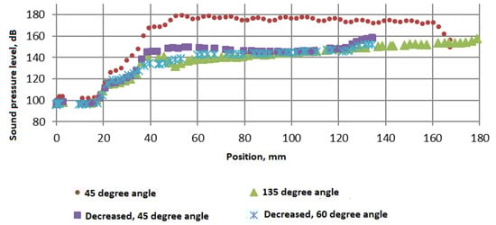 In addition to the simulation data of the partitioned cavity model (with the variation shortened by three partitions), the results between the sound pressure values of the different configurations are calculated and presented, which show the ideal design change factors for the silencer. Compared to the variations in the 45° model, the pressure level varied between 149.7 and 126.2 dB, with the 135° variant receiving 157.5–115.3 dB and the shortened 45° configuration receiving 158.1–116.4 dB results, while the 60° variant recorded 152.2–115.5 dB in the direction of entry to atmospheric conditions (Figure 8).