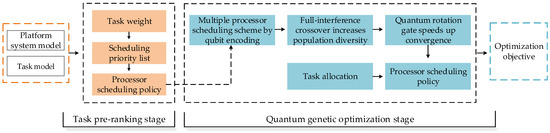 In order to improve the efficiency of heterogeneous platforms, this paper designs the HSP-QGA with improvements to the genetic algorithm using qubits and quantum rotation gates, and scenario adaptation. The core framework consists mainly of two parts: the task preordering phase and the quantum genetic optimization stage, shown in Figure 4.