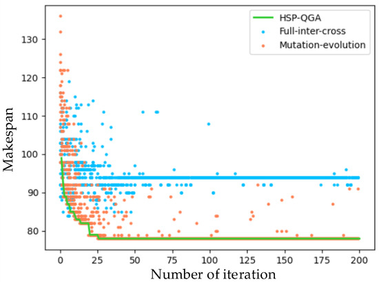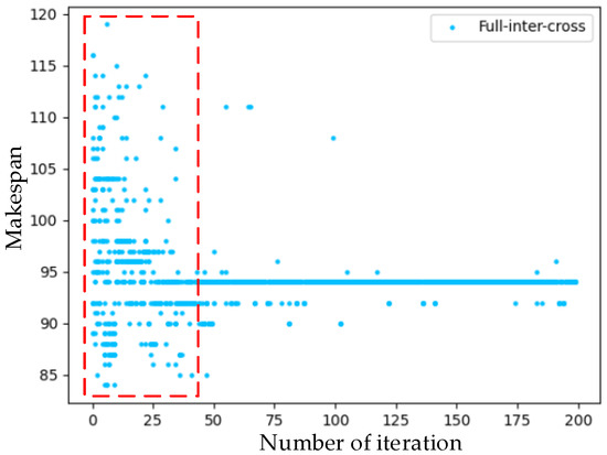 To illustrate and compare the role of the full interference crossover operation in the overall algorithm, we visualize the output of the scheduling length for each step in the algorithm. A scatter plot of the solutions after the full-interference crossover operation in each generation is shown in Figure 5. The full-interference crossover operation increases the diversity of the population and provides a sufficiently large solution space at the beginning of the iteration. A scatter plot of the nodes of the full flow of the algorithm is shown in Figure 6. Based on the solution space provided by the full- interference crossover operation, the algorithm accelerates the mutation (evolution) of the population toward the optimal solution using a quantum rotation gate. The algorithm converges after the 25th iteration. The full-interference crossover and variance converge to stable values and no longer play a role in the algorithm.