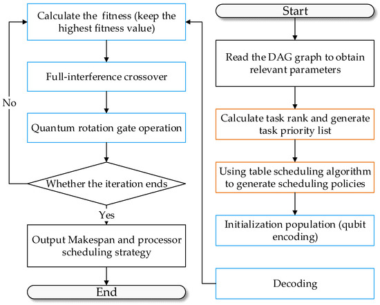 In the quantum genetic optimization stage, based on the initial scheduling policy of the processor obtained in the task pre-ordering phase, the initial scheduling policy is encoded by using qubits to obtain the initial individuals and population. This avoids the unpredictability of randomly generated initial populations and reduces the search space for understanding. The results are kept from falling into a local optimum by a full-interference crossover. The quantum rotation gate is used to make the population evolve in the direction of greater fitness, while accelerating the convergence of the solution. Finally, an approximate optimal solution is obtained with the objective of minimizing the earliest completion time in the solution space provided by this algorithm.