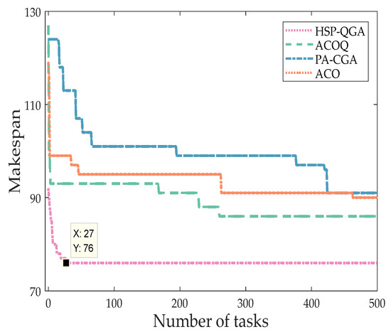 4.3.1. Comparison Experiment of Algorithm Convergence Speed and Scheduling Length under the Same Number of Tasks