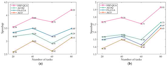 The experimental results are shown in Figure 11. When CCR is small (CCR = 0.1) or large (CCR = 4), the speedup of each algorithm does not decrease with the number of tasks, indicating that the increase in the number of tasks does not lead to the decrease in the algorithm performance and that the increase in scheduling length with the number of tasks in the experiment (2) is caused by the task scheduling attribute. In addition, the speedup tends to increase as the number of tasks increases. This proves the suitability of the HSP-QGA algorithm for computation-intensive tasks and its ability to search the solution space compared to other algorithms. It is observed that the speedup fluctuation of the same algorithm is slight for different numbers of tasks, and the trend of the line graph is similar across the algorithms. Considering that parallel factors (number of tasks per layer in the DAG) and heterogeneous factors (difference in processing ability between heterogeneous processors) are selected at random in experimental parameter settings, indicating that speedup fluctuations in the number of tasks are due to randomness generated by the DAG graphs. In addition, the speedup of HSP-QGA is more significant than other algorithms for each number of tasks, which proves that HSP-QGA has better performance.