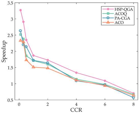 In this experiment, we set the same number of tasks, to observe the influence of different CCR values on the speedup, and compare and analyze the scheduling performance and applicability of the algorithm. The relevant parameters are uniformly set: the number of processors is 4, the number of tasks is 20, and the number of DAGs is 2. Experimental results are shown in Figure 12. When CCR = 0.1, computing costs are much higher than communication costs, the HSP-QGA has an acceleration ratio of 3.27, 24.3% higher than the PA-CGA, 29.8% higher than the ACOQ, and 40.9% higher than the ACO. When CCR = 6, communication costs are higher than computational costs, and the HSP-QGA has an acceleration ratio of 1.09, which is 13.5%, 11.2%, and 15.9% higher than the other three algorithms, respectively. When CCR = 8, the communication cost is far higher than the computation cost, and the acceleration ratio for all algorithms is less than 1. The value of CCR is usually used to determine the type of task scheduling. Tasks with CCR > 1 are expressed as communication-intensive, and vice versa for computational-intensive. Experimental results show that the HSP-QGA speedup is larger and performs better when CCR = 0.1; when CCR = 6, the performance of the algorithm is equivalent to that of a single machine, but with a slight advantage; when CCR = 8, the algorithm performance is already inferior to that of a single machine. Although the speedup of HSP-QGA is higher than other algorithms under different CCR values, the experimental results show that the algorithm is more suitable for computation-intensive task scheduling.