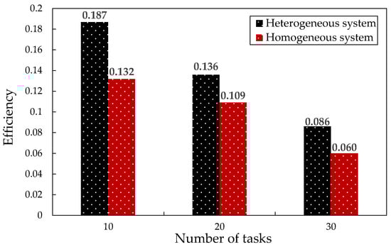 The experimental results show scheduling efficiency in 10, 20, and 30 tasks in heterogeneous and homogeneous systems, as shown in Figure 13. When the number of tasks is 10, the scheduling efficiency of the heterogeneous system is 41.7% higher than that of the homogeneous system; when the number of tasks is 20, the scheduling efficiency of the heterogeneous system is 24.8% higher than the homogeneous system; when the number of tasks is 30, the scheduling efficiency of the heterogeneous system is 43.3% higher than that of the homogeneous system. Considering the negligible error caused by the difference in processor release performance and the randomness of generated DAG, the results show that HSP-QGA is more appropriate for heterogeneous scheduling platforms.