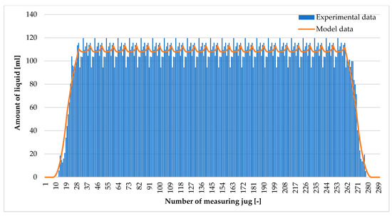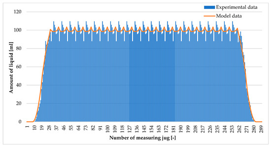 The test results are shown in Figure 1, Figure 2, Figure 3, Figure 4 and Figure 5, which show the fit for each spray nozzle type. The y-axis shows the amount of liquid in the cylinders, while the x-axis shows the number of cylinders corresponding to the 14.5 m width of the sprayer’s field boom. Results of spray fallout are the same as the real work of a boom field sprayer. Nozzle axes were spaced every 500 mm so that streams of liquid to overlap. The graphs present the results of the spray fall distribution for both experimental data and data generated using the model. The amount of liquid increased with increasing nozzle size.