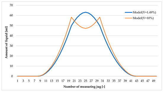 The permissible limits of deviation in the amount of liquid accumulated in the containers from a single nozzle of the new nozzle (CV = 1.49%) in relation to the possible level of wear (CV = 10.000%) are presented in Figure 6.