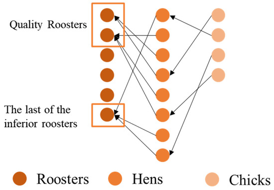 Hens constitute the majority of the swarm. Led by the rooster, the hens perform a local search near the rooster and, thus, the merit of the rooster determines the merit of the hen’s search space. In the original algorithm, the rooster followed by the hen is randomly selected from the whole rooster swarm, and although this approach can improve the diversity of solutions, it limits solution accuracy. Thus, a dynamic constraint is proposed for the roosters, which is given to the high-quality roosters by randomly selecting them from all the roosters, while an inferior rooster is added to the high-quality roosters to ensure the diversity of solutions. As the number of followed roosters gradually decreases, the number of follower hens per rooster gradually increases, which in turn improves the search accuracy in the region around the current rooster. Figure 2 shows the concept of the constraint strategy for hen-following roosters.