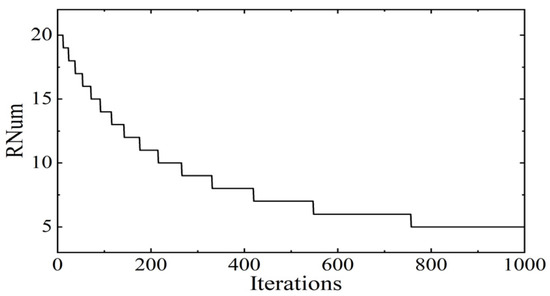 The curve for the change in the number of constrained roosters is shown in Figure 3, where the maximum number of iterations , and the total number of roosters . It can be seen that the number of constrained roosters abruptly decreases in the first 500 iterations and changes relatively little in the last 500 iterations. The above requirements are met.