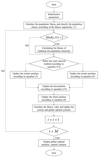 Chicken swarm optimization (CSO), proposed by Meng et al. [12], is a novel swarm intelligence optimization algorithm. It can be used to optimize various specific problems by simulating the intelligent behavior of a swarm composed of roosters, hens and chicks foraging for food. The chicken swarm optimization algorithm has a clear structure and robust searching ability, as well as being easy to understand and implement. Additionally, it has better convergence than the particle swarm algorithm, differential evolution algorithm and artificial bee swarm algorithm [12]. It has several research applications, such as task scheduling, route optimization, etc. [13], but suffers from the problem of falling into local optimality, leading to premature maturity and a low solution accuracy. To address the issues of the CSO algorithm, researchers have proposed improvement methods. Irsalinda et al. [14] proposed a multi-stage CSO algorithm based on the search characteristics of different chickens. In the first stage, the algorithm focuses on the hen update method to strengthen the global exploration ability; in the second stage, the algorithm focuses on the chick and rooster update methods to reflect the advantage of local exploitation. Zhang [15] proposed an improved CSO algorithm based on forward- and backward-learning rooster particles, allowing it to positively learn from the optimal particles in each iteration so that the algorithm can quickly enter the most promising region to find food while learning backward from the worst particles to jump out of the local optimum when the algorithm is stuck in the local optimum solution. Zhang et al. [16] proposed improvements using X-best bootstrap individuals and a dynamic rank update mechanism. The best individuals were introduced to accelerate the convergence in the individual update phase, and the influence of ordinary individuals on the best individuals was properly balanced. Additionally, the contribution of the population rank update mechanism to the algorithm convergence was enhanced through dynamic optimization of the rank update parameters. Gu et al. [17] removed the chicks, simplified the algorithm, proposed an improved update for both males and females based on inverted s-shaped inertia rights and added an adaptive update strategy to the update process for females. Liang et al. [18] introduced an improved search strategy with Levy flight characteristics into the location update equation for hens, helping to increase the algorithm’s perturbation and population diversity. Secondly, a nonlinear decreasing strategy was added to the chicken position update equation to improve the chickens’ self-learning ability.