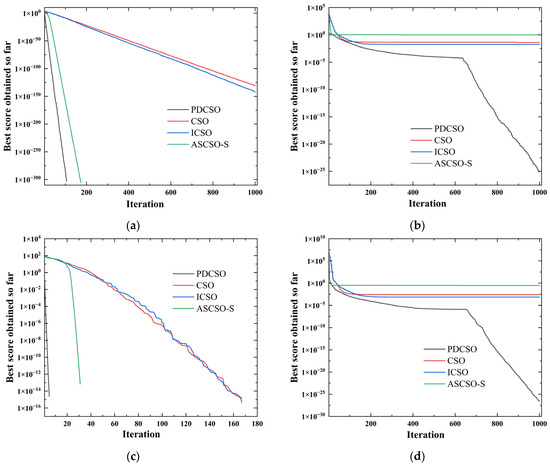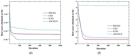 To verify the effectiveness of the proposed improvement mechanism with PDCSO, the improved algorithm was tested with 18 test functions. The simulation environment was MATLAB, and the simulation computer was configured with an Intel® Core™ i7-6700HQ CPU with 2.60 Hz and 16 GB RAM. The information about the test function is shown in Table 1, illustrating the test function’s search range, test dimension and theoretical optimal value. The adjustable dimensionality test functions can be used to test the performance of the algorithm with high dimensionality, and is a fixed-dimension test function. The main algorithms CSO, PDCSO, ICSO [18] and ASCSO-S [17] were compared in the tests. The parameter settings for each algorithm are shown in Table 2. The maximum number of iterations for each algorithm was 1000, and the test results after 30 independent runs are shown in Table 3. Figure 6 shows a partial iterative curve.