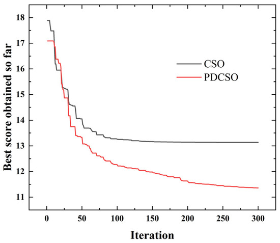 A five-order B-sample was used as the interpolation curve, the start–stop speeds of all joints were set and the acceleration was set as 0. Trajectory optimization simulation was performed with the standard CSO and the PDCSO algorithms, and the parameters for both the CSO and PDCSO algorithms were . Iterative results in Figure 8 were obtained, and the position curves for each joint are shown in Figure 9.