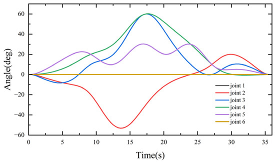The joint trajectory profile can be obtained by interpolating the above joint position–time node sequence with polynomial or spline functions. The former improves the execution efficiency of the arm, and the latter ensures that shocks are minimized during the execution of the motion trajectory, optimizing two conflicting kinematic performance metrics. The less that joint shocks and drive torque fluctuations occur, the smoother the arm motion.