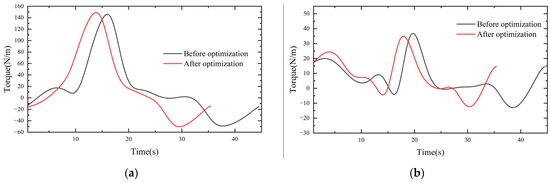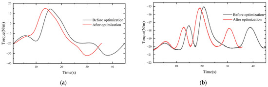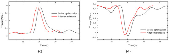 The kinematics simulation analysis of the robot was run on the platform ADAMS. The driving of each joint was carried out in this dynamic simulation, and the torque change curve for each joint was obtained. In this study, there was no position change between joint one and joint six; therefore, only the other four joints were considered, and the torque change comparison curve is shown in Figure 10.