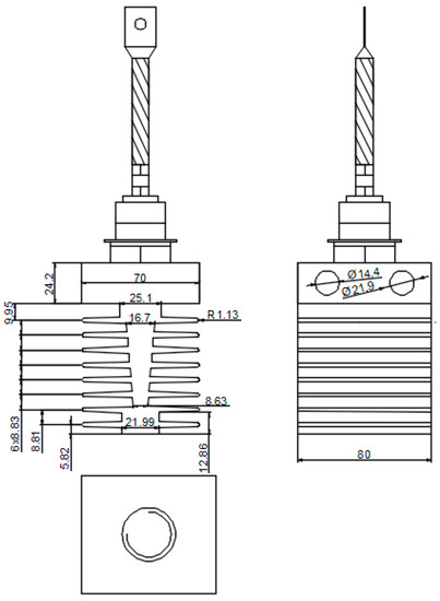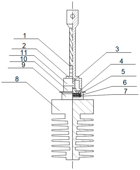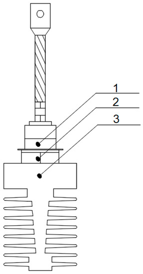 In this work, a D00-250-10 power diode (Lamina, Piaseczno, Poland) (IF = 250 A, VF = 1.5 V) was used. The design of this diode is similar to that of the D61-200-22-N0-ABG diodes (Poweralia, Barcelona, Spain) and SCDR0240N12M diodes (Poweralia, Barcelona, Spain). The diode D00-250-10 is shown in Figure 1.