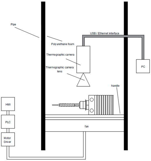 The tube was mounted in a vertical orientation. A holder for a thermal imaging camera was placed inside the tube. Below this, a diode holder with a heat sink was placed. A fan was placed at the bottom of the resulting test rig to force air flow. The speed of the fan was controlled by a stepper motor controller, which in turn was controlled by a PLC (programmable logic controller) (Siemens S7-1200, 1215 DC/DC/DC). An HMI (Human Machine Interface) panel was attached to the PLC. A section of the measurement system that was responsible for the air flow around the diode under testing is shown in Figure 4.