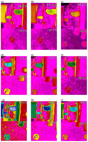 Thermograms recorded for (a) Pj = 46.23 W and v = 0.75 m/s, (b) Pj = 46.23 W and v = 1 m/s, (c) Pj = 46.23 W and v = 1.5 m/s, (d) Pj = 74.48 W and v = 0.75 m/s, (e) Pj = 74.48 W and v = 1 m/s, (f) Pj = 74.48 W and v = 1.5 m/s, (g) Pj = 111.75 W and v = 0.75 m/s, (h) Pj = 111.75 W and v = 1 m/s, and (i) Pj = 111.75 W and v = 1.5 m/s.