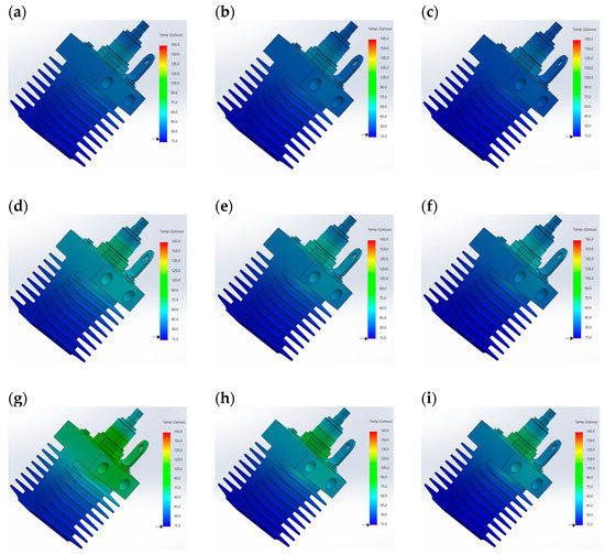 Temperature distributions obtained for (a) Pj = 46.23 W and v = 0.75 m/s, (b) Pj = 46.23 W and v = 1 m/s, (c) Pj = 46.23 W and v = 1.5 m/s, (d) Pj = 74.48 W and v = 0.75 m/s, (e) Pj = 74.48 W and v = 1 m/s, (f) Pj = 74.48 W and v = 1.5 m/s, (g) Pj = 111.75 W and v = 0.75 m/s, (h) Pj = 111.75 W and v = 1 m/s, and (i) Pj = 111.75 W and v = 1.5 m/s.