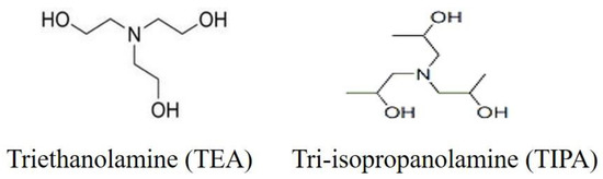 - Shi, Z.; Shi, C.; Liu, H.; Li, P. Effects of triisopropanol amine, sodium chloride and limestone on the compressive strength and hydration of Portland cement. Constr. Build. Mater. 2016, 125, 210–218. [Google Scholar] [CrossRef]