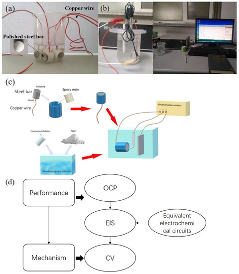 - The adsorption and oxidation–reduction reactions that occurred on the steel bar’s surface were comparatively analyzed and experimentally determined by the cathodic potential and the reduction peaks in cyclic voltammetry for the first time. The organic compounds could adhere on steel bar surface, thereby reducing the corrosion current densities in the wide passivation interval of the voltammograms. Additional protective precipitates (FePO4 and Fe2(MoO4)3) formed by the inorganic substance were detected, which contributed to corrosion resistance.