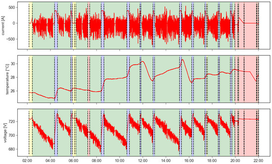 Figure 1. Typical usage profile of a bus that uses opportunity charging. Operation sections are shown in green. Charging times are marked blue, idle times are yellow and data gaps are red.- ◦
