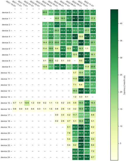 - aging parameter database: This model part contains the aging information of each vehicle in the fleet and outputs the SOH based on the device’s , the lifetime as well as the total charge throughput. To calculate the SOH, vehicle-specific calendric and cyclic aging rates are stored. An advantage is the easy detection of peculiarly aged batteries by investigating the SOH scaling factors (see Section 4.3).