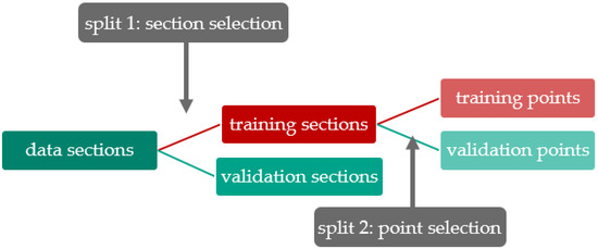 There is a twofold split of the data (see Figure 3). Firstly, whole sections are partitioned into a training and a validation data set. The validation sections are not used during the training process in any way and solely serve validation and evaluation purposes. Secondly, the data in the training set are once more split into training and validation points. These “training validation points” are used to perform early stopping. This prevents overfitting by terminating the training process if the fit on this second set of validation points does not improve.