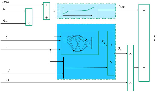 - core battery model: The structure of this core battery model is shown in Figure 6. It consists of a part which describes the OCV as a function of the SOC and a part modeling the overpotential. Using temperature, current and SOC information as well as the actual SOH (given by the scaling factors and ), the battery voltage is predicted. Dynamic effects are taken into account by using multiple low-pass time filters of the current signal. Thus, previous current values are considered. This is inspired by ECMs where this is done using RC-elements. Recurrent neural networks are an alternative implementation, especially with Long Short-Term Memory. Although they are widely employed, our approach reduces the parametrization effort and is more robust as is shown in [26].