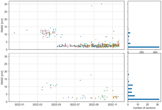 Evaluation of the selected sections (one color per device). The upper plots show the RMSE-vs-time diagram and the corresponding sections-vs-time histogram of the training sections. The lower plots show the same for the validation sections. (See also the remark concerning the change of sampling rate at the end of the section above).