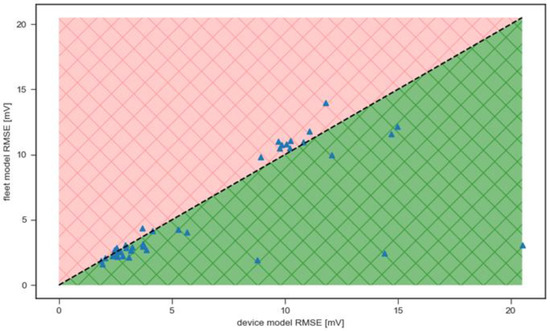 Comparison of RMSE of validation sections after training with all fleet data (approach 1.) versus training with data from a selected device (approach 2.). The errors could be reduced for most sections.