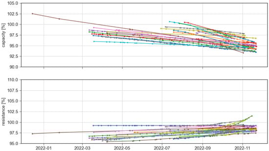Nevertheless, none of the analyzed batteries seem to be in a critical state. Their individual differences for resistance and capacity over time are within normal standard deviation. However, if the respective trends should accelerate, we suggest a more detailed inspection, including cell inhomogeneity analysis for the high resistance batteries.