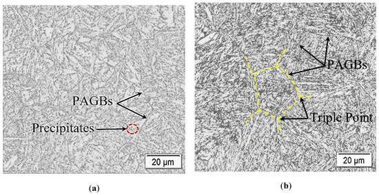 Heat treatment of P91 steel produces a tempered lath martensite structure with M23C6 and MX (M = Niobium, Vanadium and X-carbon) precipitates [2]. During normalisation, the homogenisation of the microstructure occurs, causing an untempered lath microstructure with a small number of precipitates and a high dislocation density. Tempering causes the precipitation of the M23C6 carbides along the grain boundaries and MX particles in the matrix [19]. The high dislocation density and the M23C6 precipitates are responsible for the pinning of lath boundaries, while MX precipitates prevent dislocation movement [2,17]. The heat treatment process, therefore, restores the effects of the creep process and provides a stable microstructure for the steel to achieve high creep strength [20].
