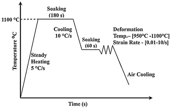The uniaxial hot compression parameters using Gleeble® 3500 equipment were as follows: deformation temperatures of 900 °C, 950 °C, 1000 °C, and 1050 °C and strain rates of 0.01 s−1, 0.1 s−1, 1 s−1, and 10 s−1. The samples were deformed to a total strain of 0.6. Before testing, an R-type thermocouple was welded at the midpoint on the samples to monitor temperature during the deformation process. Figure 3 is a schematic diagram illustrating the thermal deformation process used in this study. All the specimens were heated at 5 °C/s to 1100 °C and held isothermally for 180 s before cooling to the deformation temperature.