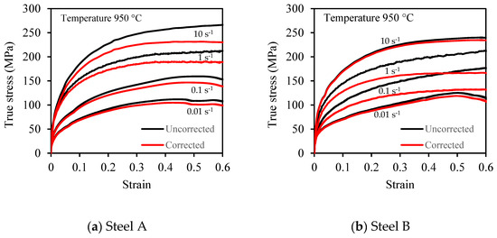 Flow stress–strain curves provide information on metal deformation behaviour during forging. However, the accuracy of the curves is affected by the interfacial friction between the tool and the workpiece as it modifies the force required during deformation [33]. At the sample and the die end, graphite foil and nickel paste were placed to reduce the effect of friction during deformation. At high strain, however, the friction effect is more significant, causing inhomogeneous deformation and hence contact between the samples and die surface. This is known as barrelling, and the flow stress–strain curves have to be corrected for friction before further analysis [33,34]. The barrelling coefficient was calculated using the sample geometry size according to Roebuck et al. [35]. Equation (1) was used to determine the barrelling coefficient, b, with the allowable range of barrelling coefficients as 1 ˂ b ≤ 1.1 [36]. Friction within this range is negligible and only stress–strain curves of samples with a barrelling coefficient beyond this range were corrected for friction [37]. Figure 4 shows plots of uncorrected and friction-corrected flow stress curves of the two P91 steels at a temperature of 950 °C and strain rate of 0.01 s−1, 0.1 s−1, 1 s−1, and 10 s−1. The results show that the measured flow stress values in the stress–strain curves were higher than the friction-corrected values. This variation may be due to the interfacial friction effect experienced at the test sample and anvil interface.