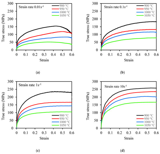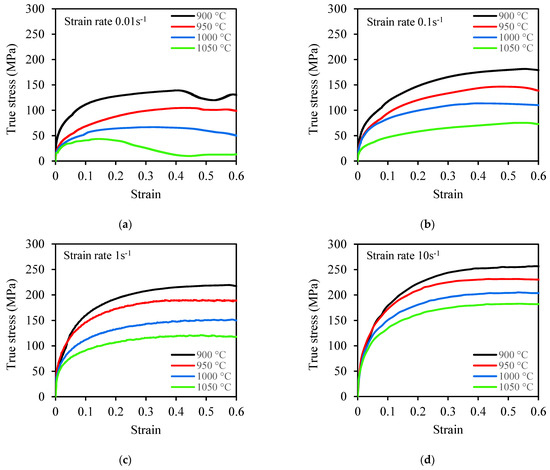 - The flow stress–strain curves show that the flow stress increased with an increase in strain rate (0.01 s−1 to 10 s−1) and decreased with an increase in temperature (900 °C to 1050 °C) for the two steels. The flow stress–strain curves exhibited a DRV+WH as the deformation mechanism.