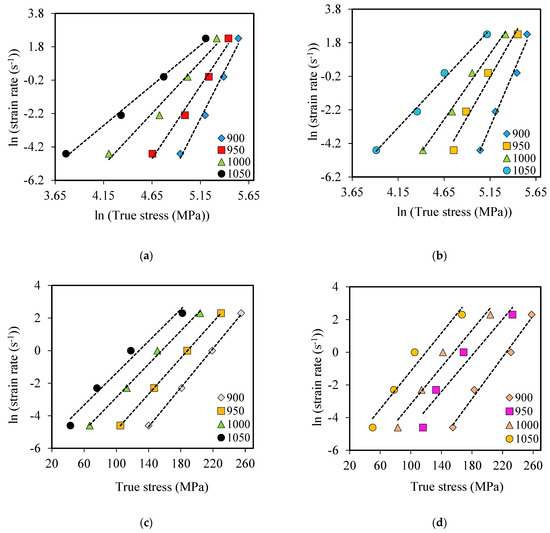 The relationship between the Zener–Hollomon parameter and flow stress is expressed by Equations (4) to (6) [49]. The terms in these equations—n′, β, n, and α—are material constants. Equation (4) is the power law applied for low stresses (ασ ˂ 0.8), as it breaks down at higher flow stress. Equation (5) is the exponential law used for higher stress (ασ > 1.2) and breaks down at a strain rate under 1 s−1 and high temperature [50]. Equation (6) is a hyperbolic sine function equation developed by Sellars and Tegart [51] to be applicable to a wide range of stresses (both high and low). Equations (4)–(6) can also give Equations (7) and (9) [25]: