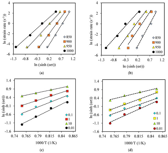 The stress multiplier α is an adjustable constant. This α-value is obtained from: α = β/n [50]. The stress exponent, n, and activation energy, Q, are determined by taking logarithms on both sides of Equation (9), which gives Equations (12) and (13) [50]. These equations are plotted as ln έ versus ln (sinh (σα)) and ln (sinh (σα)) versus (1000)/T, as shown in Figure 8a,b. The average value of the slopes obtained in these plots provides n and S values for calculating the activation energy Q [25].