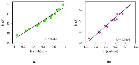 The relationship between the flow stress and the Zener–Holloman parameter is given in Equation (6). The structure factor (A) is determined by taking logarithms on both sides of Equation (6), as in Equation (14) [21]. The A value is the intercept of the best fit line obtained by plotting ln (Z) versus ln (sinh(ασ)), as shown in Figure 9 [52].