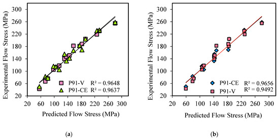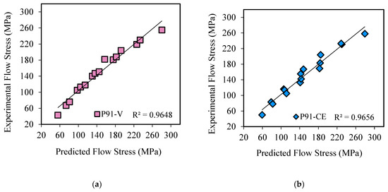 The accuracy of constitutive Equations (18) and (19) to predict flow stress was evaluated by comparing predicted to experimental data. Figure 10a,b show graphical plots for the two equations obtained at different strain rates and temperatures. The graphs indicate a close correlation between the flow stresses (predicted and experimental) of these two steels investigated.