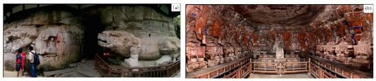 Cave temples are a special form of architecture that accompanied the introduction of Buddhism from India to China, with Buddhism as the main line, spreading from west to east and south along the Silk Road with a wide distribution [1,2]. The grotto temples with have a long history and not only constitute the eastward history of Buddhism but also record the historical and cultural characteristics of the Chinese nation in different periods. They are non-renewable resources and precious cultural relics [3]. The Dazu rock carvings are among the rarest surviving artefacts of the cave temples, an art form that continued into the Song dynasty in Sichuan, Chongqing, and other areas of China [4,5]. Cave temples are carved directly into the natural mountain and cliff face [6]. However, as the cliff face of the mountain is also usually the site of the development of the unloading zone, the cave body is usually cut by the fissures of the unloading zone, which, combined with thousands of years of internal and external camp forces, can easily produce unstable characteristics such as toppling, devolution, and landslides, threatening the safety of cave temples’ cultural relics [7,8]. Stone heritage and ancient sites account for over 50% of China’s cultural heritage [5]. In the field of rock stability assessment of cave temples, their heritage properties result in conventional assessment methods often being ineffective, and conditions such as non-destructive means of detection, the high spatial accuracy of assessment models, and precise assessment parameters need to be met as much as possible [9]. Taking Dunhuang Mogao Grottoes as the research objects, Fu et al. [10] analyzed the influencing factors of dynamic damage of the surrounding rock under seismic load and explored the damage of the surrounding rock and its subsidiary structure caused by earthquakes based on the finite element method. Wang et al. [11] explored the damage process of the roof slab of Longyou Grotto and numerical simulation and back analysis of rheologic fracture were carried out by using in situ damage pattern and deformation data. Chen et al. [12] analyzed the stress distribution and deformation characteristics of the surrounding rock mass under different tourist static loads on the long-term stability of the Mogao Grottoes using a finite difference method. The analysis showed that these will produce a stress concentration and large vertical displacement on the cave roof and densely distributed cave area. Over the centuries, with the constant action of natural forces and the erosion of various degradation factors, the side walls and roof of the cave have spalled, the lower support body has broken up, and the boundary conditions of the rock have deteriorated, posing a serious threat to the safety of the cave [13,14,15].