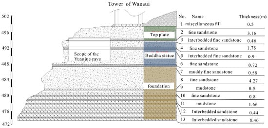 The stratigraphy of Yuanjue Cave is typical of the red-bedded sandstone of the Sichuan Basin, which is a river–lake sedimentary environment, with horizontal fine-grained sandstone and mudstone interlayers as the main stratigraphic layers, and local sandstone layers which contain more schistose mica in thin layers. The lithological distribution of the stratigraphy of the south cliff where Yuanjue Cave is located and the relative relationship between Yuanjue Cave and the cliff wall are shown in Figure 2.