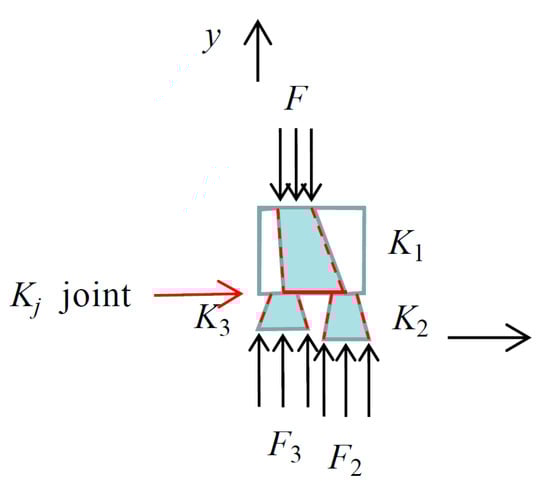 In parallel arrangement, if the total area of the upper slates is A, the ratio of the effective contact areas of each contact surface to the total area of the upper slates are , , , , , and the moduli of elasticity of the sized slates and joints are , , , , and the ratio of the height of slate 3 to that of slate 2 is . For the convenience of calculation, it is still assumed that the internal stress influence range varies linearly and the stress is uniformly distributed within the influence range, whose calculation sketch is shown in Figure 8, where the contact area of the lower surface of the upper slate is equal to the sum of the contact area of the upper surface of the two stones below.